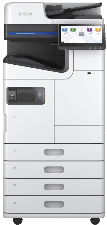 The WorkForce® Enterprise AM-C550 A4 Color MFP delivers powerful business productivity with print speeds up to 55 ISO ppm†, high-performance scanning, a fast first page out and Legal-sized media support. Powered by revolutionary PrecisionCore Heat-Free technology, it’s engineered for exceptional reliability and provides outstanding image quality, along with the lowest power consumption in its class1—up to 65% lower vs. color laser printers1. Remarkably flexible to fit virtually any workspace, the AM-C550 can be configured as either a desktop or floor-standing unit with the option to add up to three cassettes for a total of five paper sources. And it offers a user experience consistent with our WorkForce Enterprise AM Series A3 models, including a large, intuitive 10.1″ customizable color touchscreen for easy navigation and support for the Epson® Solutions Suite.